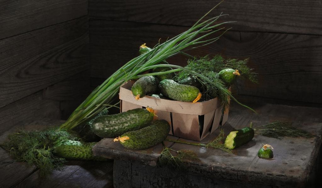 Обои Свежие огурцы на столе с зеленым луком и укропом