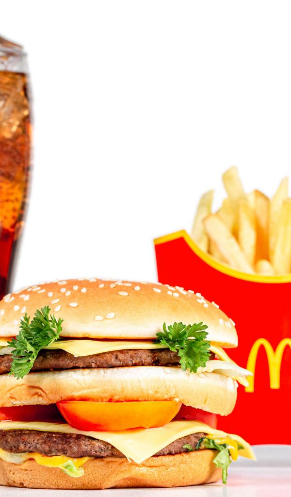 Обои Кока кола со льдом на белом фоне с гамбургером и картофелем фри