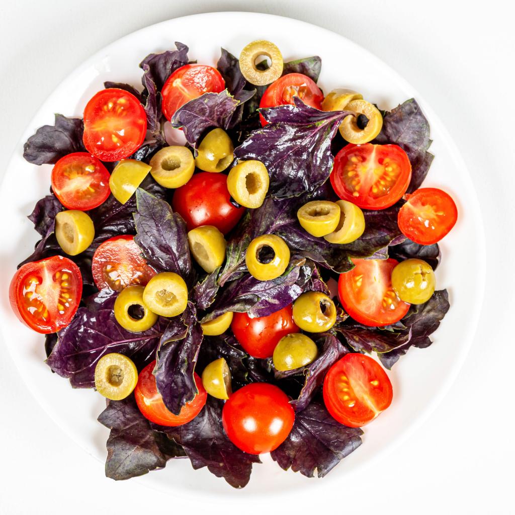 Обои Салат с листьями базилика, помидорами и оливками на белом фоне