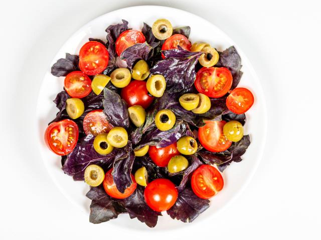 Обои Салат с листьями базилика, помидорами и оливками на белом фоне