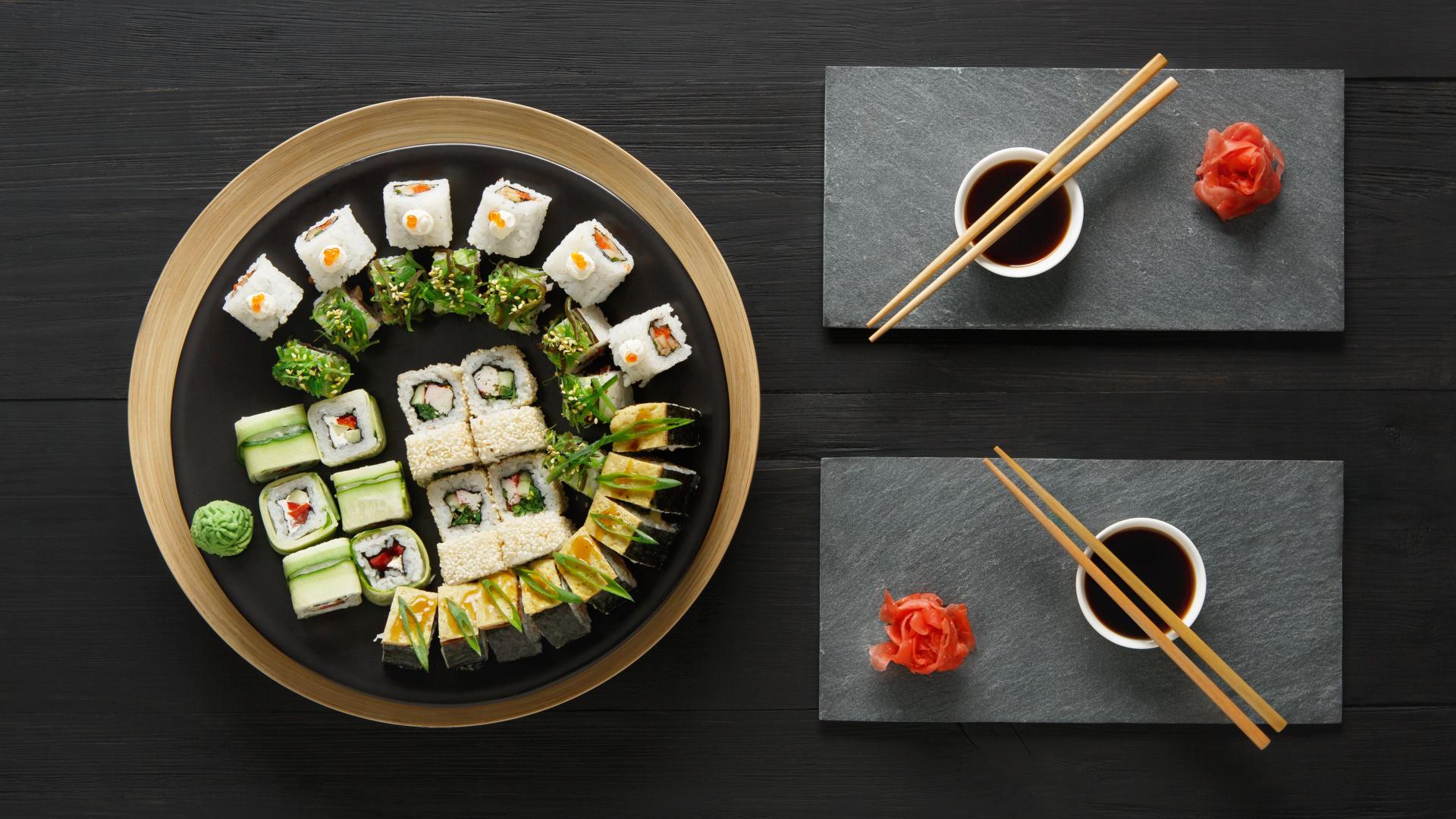 Обои Вкусные роллы на столе с соевым соусом и палочками