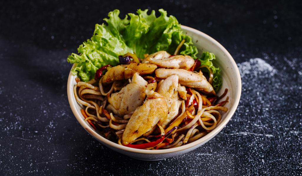 Обои Спагетти в соусе с курицей и листьями салата