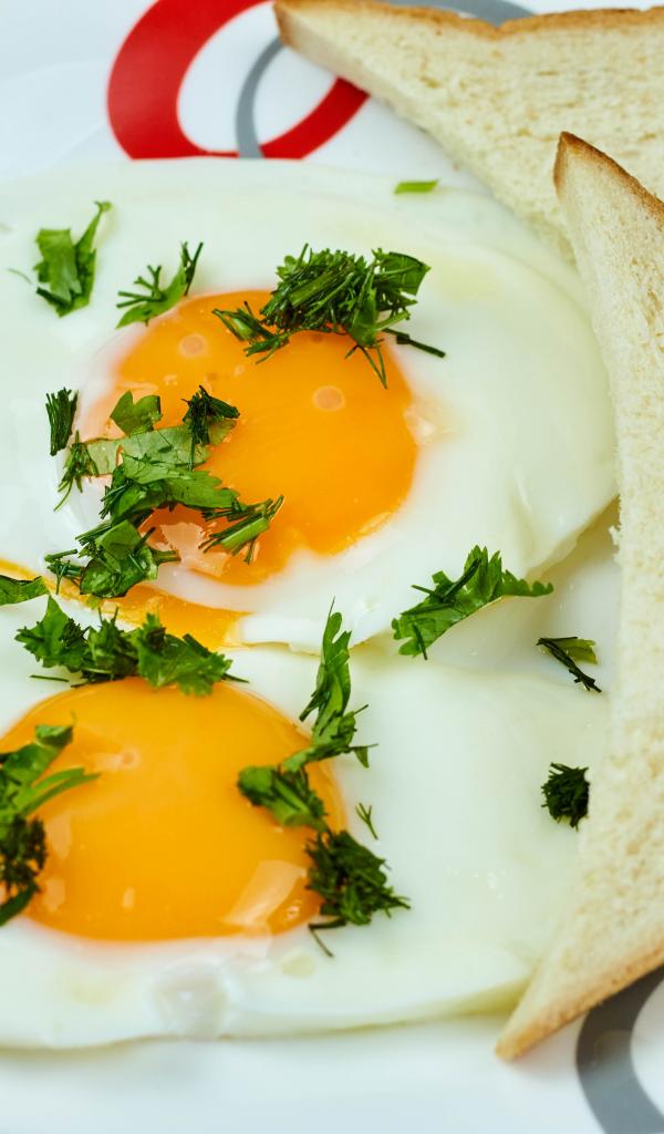 Обои Яичница глазунья с зеленью на тарелке с хлебом
