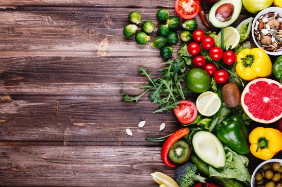 Обои Много свежих овощей и фруктов на деревянном столе