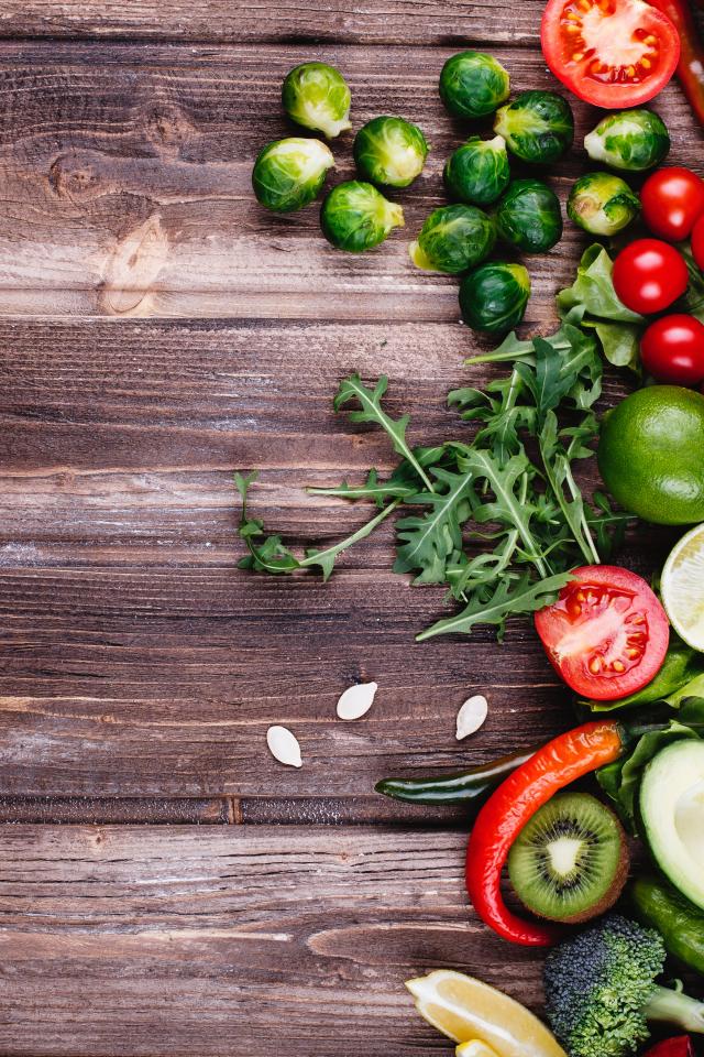 Обои Много свежих овощей и фруктов на деревянном столе