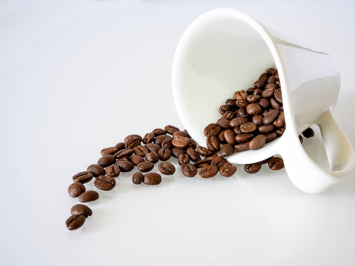 Обои Кофейные зерна высыпают из белой чашки на стол