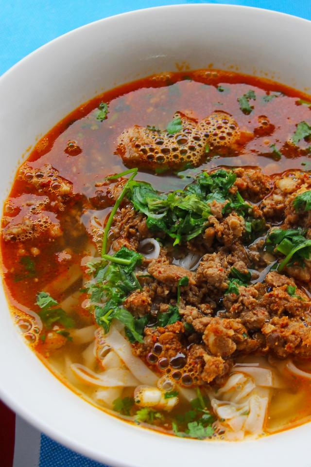 Обои Острый суп с лапшой и мясом в тарелке с зеленью