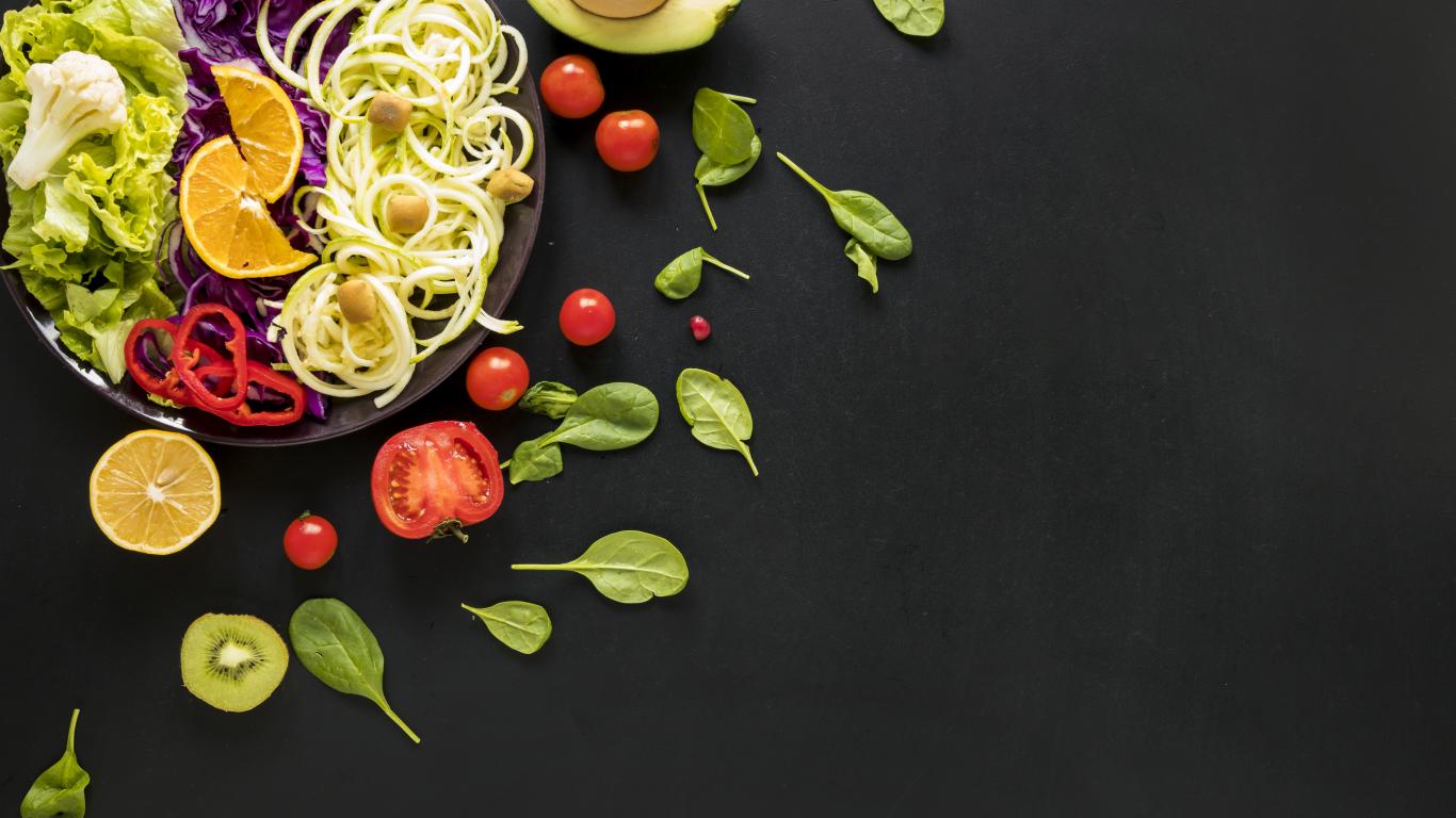 Обои Салат из свежих овощей на черном столе с базиликом, помидорами и авокадо