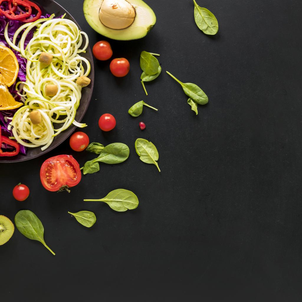 Обои Салат из свежих овощей на черном столе с базиликом, помидорами и авокадо