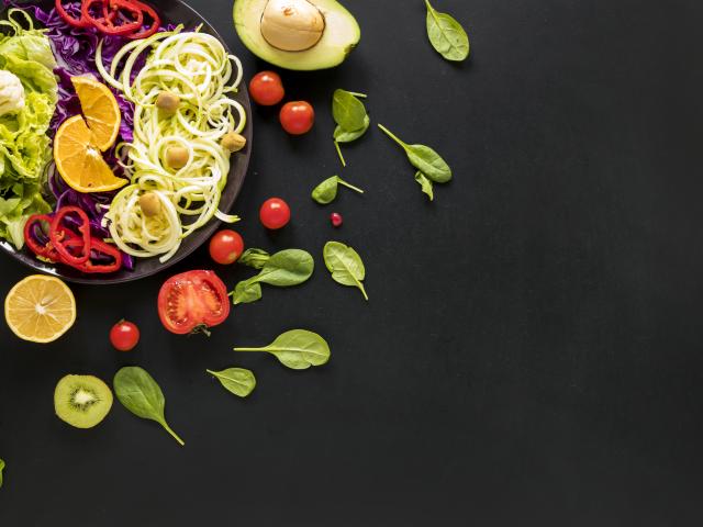 Обои Салат из свежих овощей на черном столе с базиликом, помидорами и авокадо