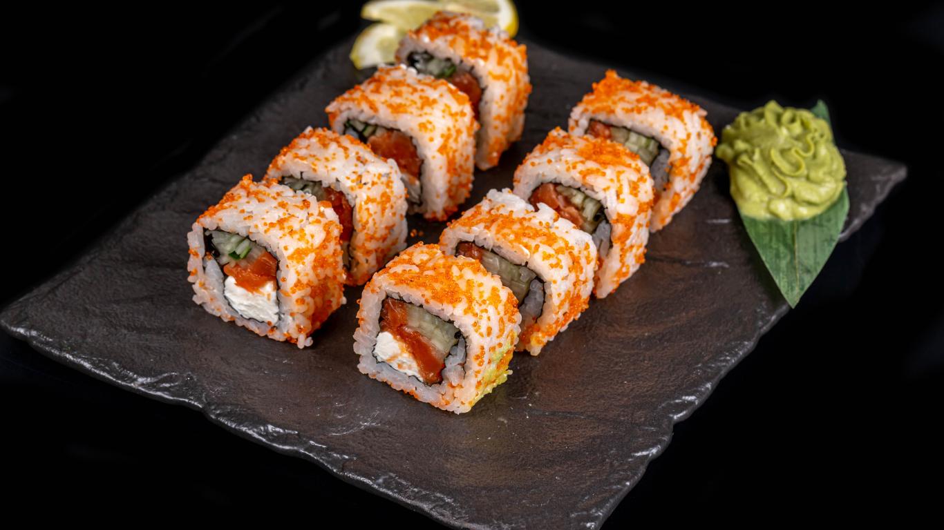 Обои Аппетитные японские роллы с соусом васаби на черном фоне