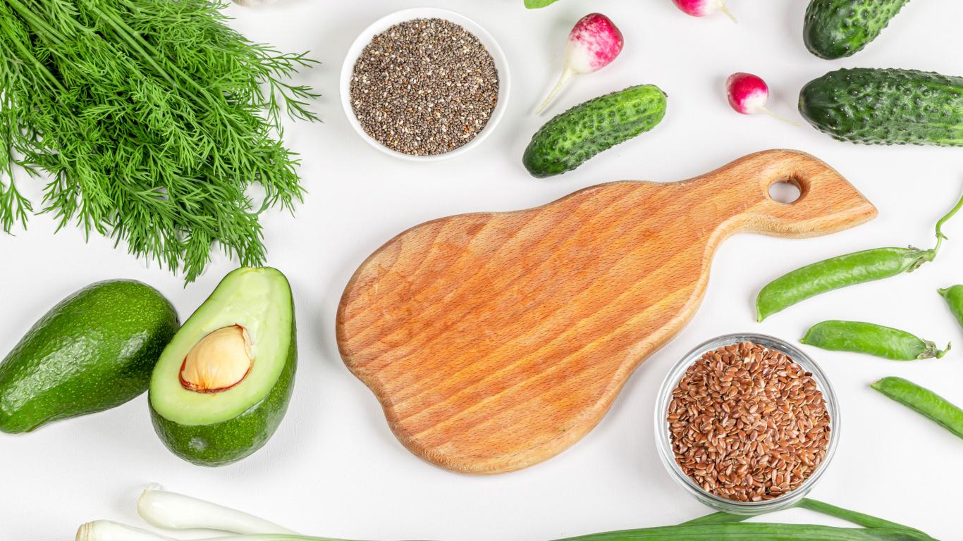 Обои Свежие огурцы, авокадо, редис и укропом на столе с зернами