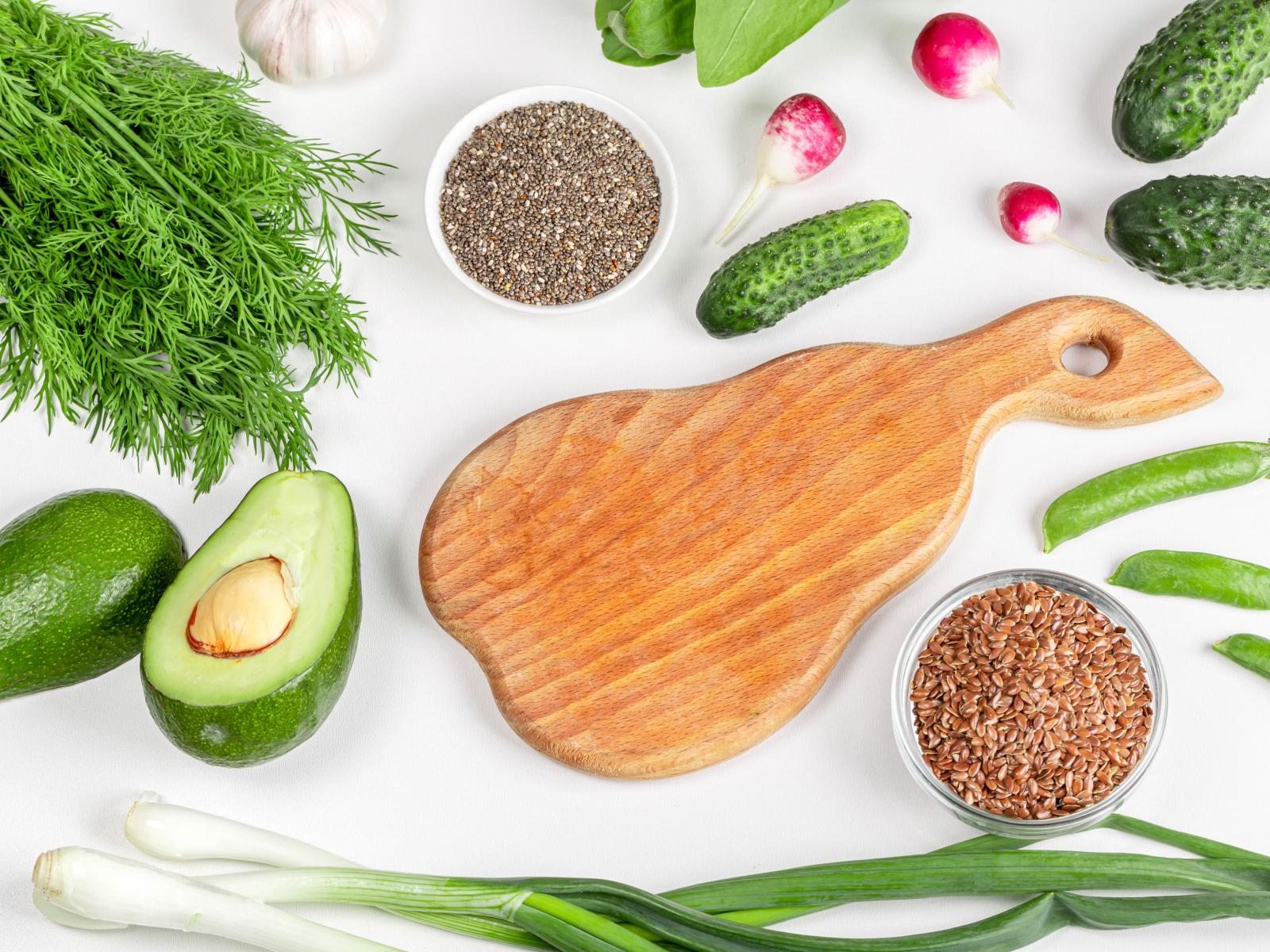 Обои Свежие огурцы, авокадо, редис и укропом на столе с зернами