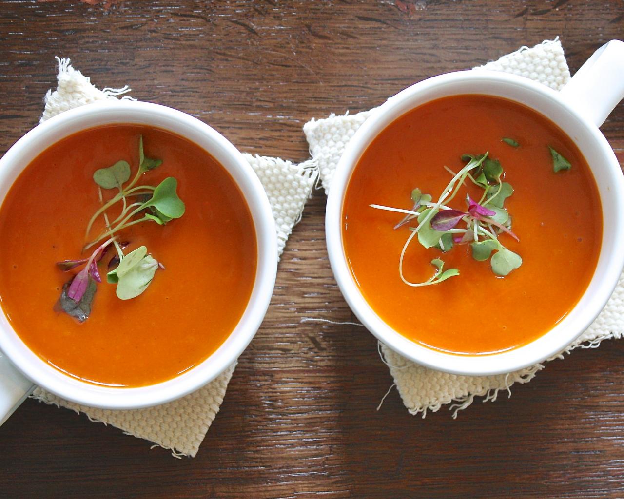 Обои Красный суп пюре в белых чашках на столе