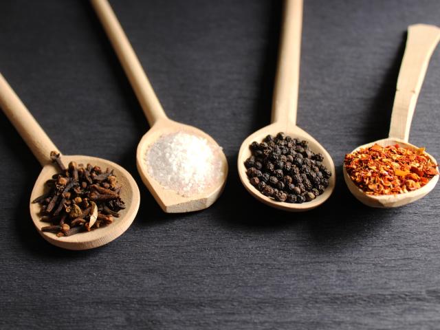 Обои Четыре деревянных ложки со специями на сером столе