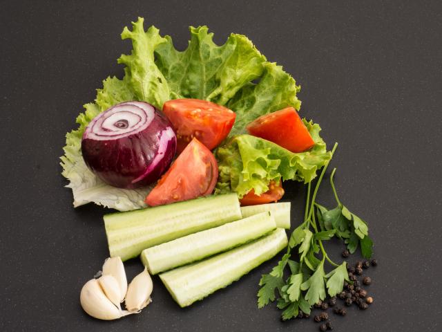 Обои Свежие помидоры, огурцы, лук и листья салата