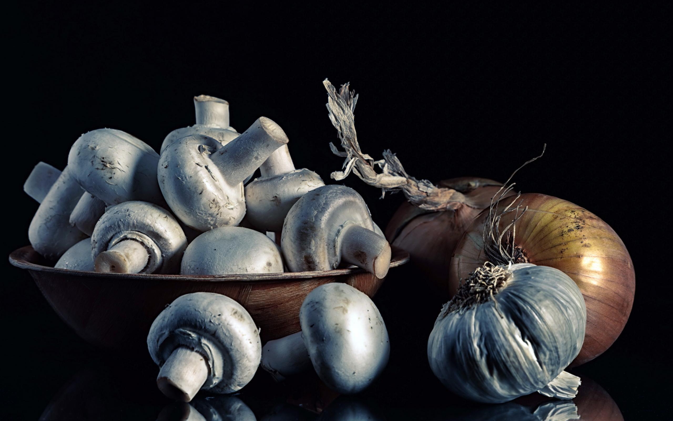 Обои Свежие шампиньоны с луком и чесноком на черном фоне