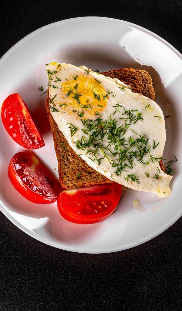 Обои Кусок хлеба с яичницей на тарелке с помидорами