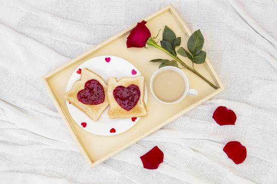 Обои Два тоста с джемом на разносе с розой и кофе