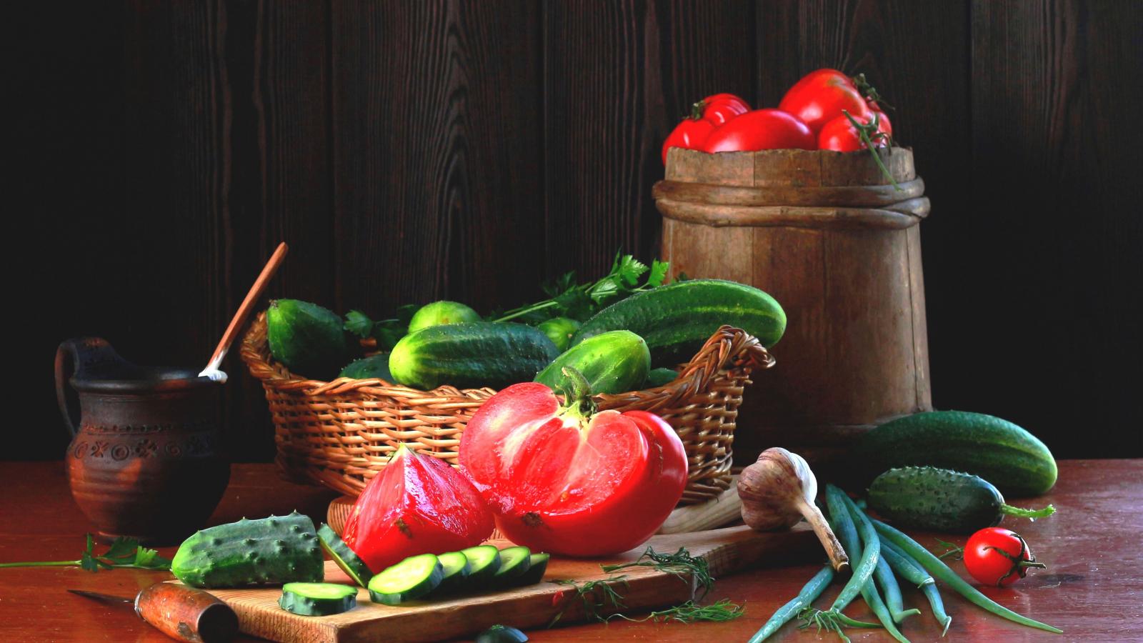 » Обои Свежие огурцы и помидора на столе с зеленым луком