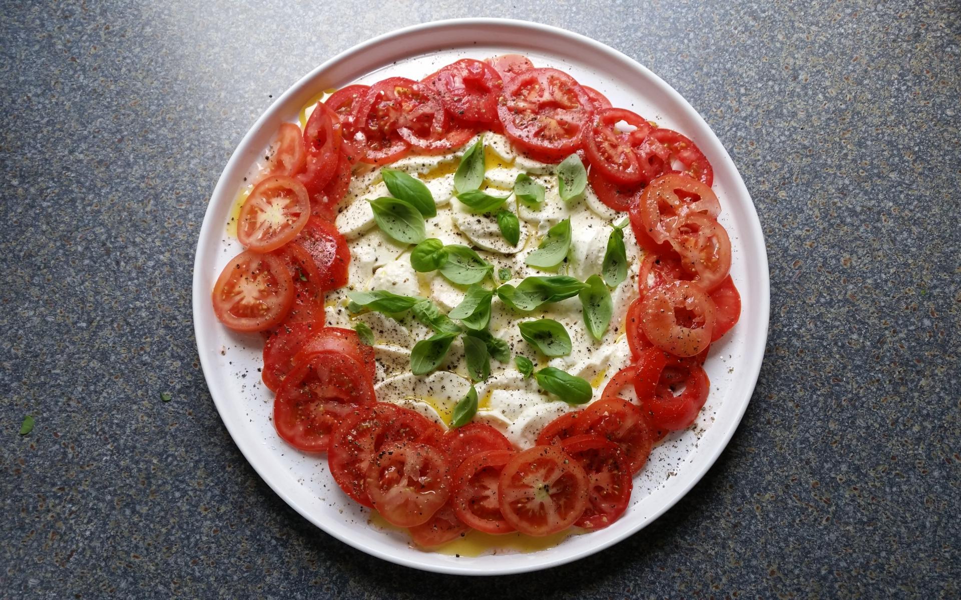 Обои Итальянский сыр моцарелла с помидорами и базиликом