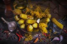 Обои Маринованные помидоры в банках на столе со свежими