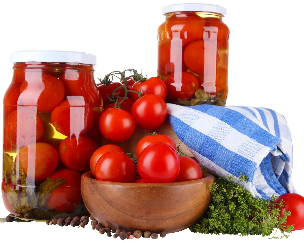 Обои Маринованные помидоры в банках на столе со свежими