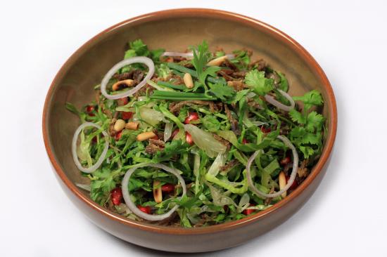 Обои Салат из зелени с мясом на сером фоне