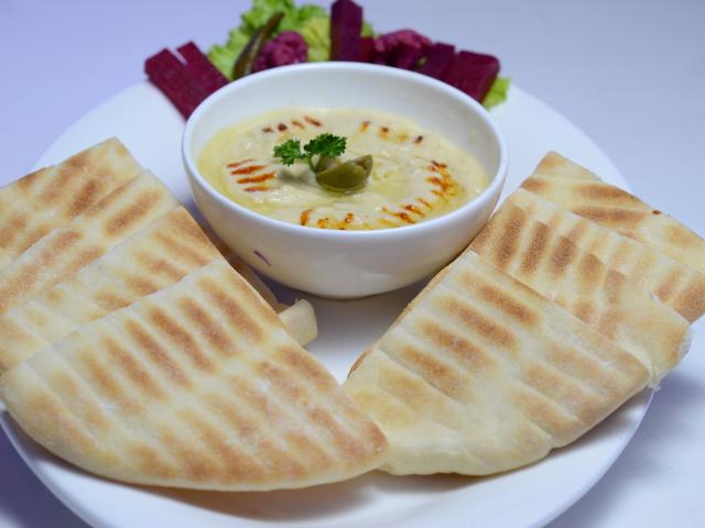 Обои Блюдо хумус размазан по тарелке на сером фоне