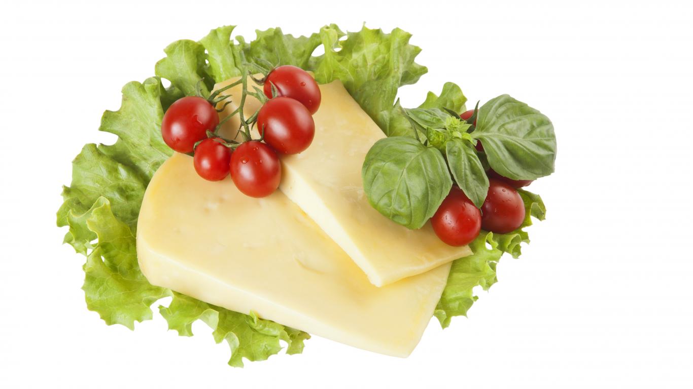 Обои Твердый сыр, листья салата, помидоры и базилик на белом фоне