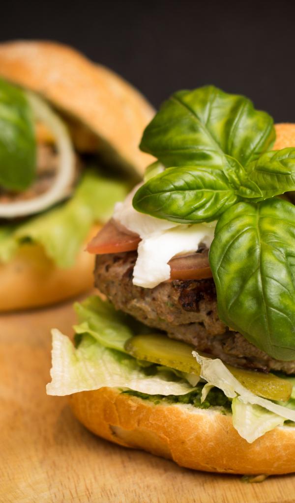 Обои Домашние гамбургеры с котлетой и листьями базилика
