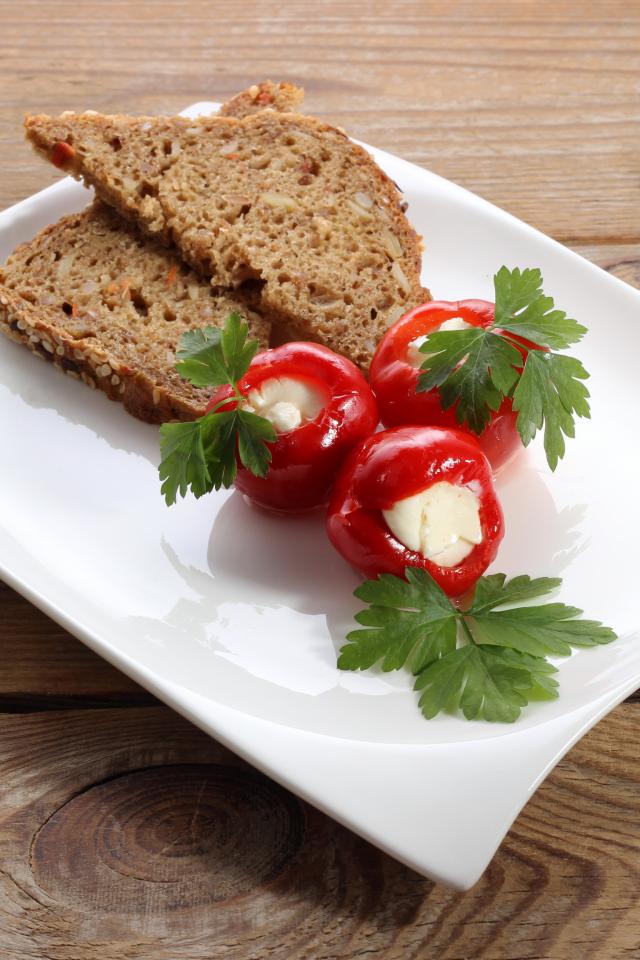 Обои Фаршированный перец на большой белой тарелке с хлебом