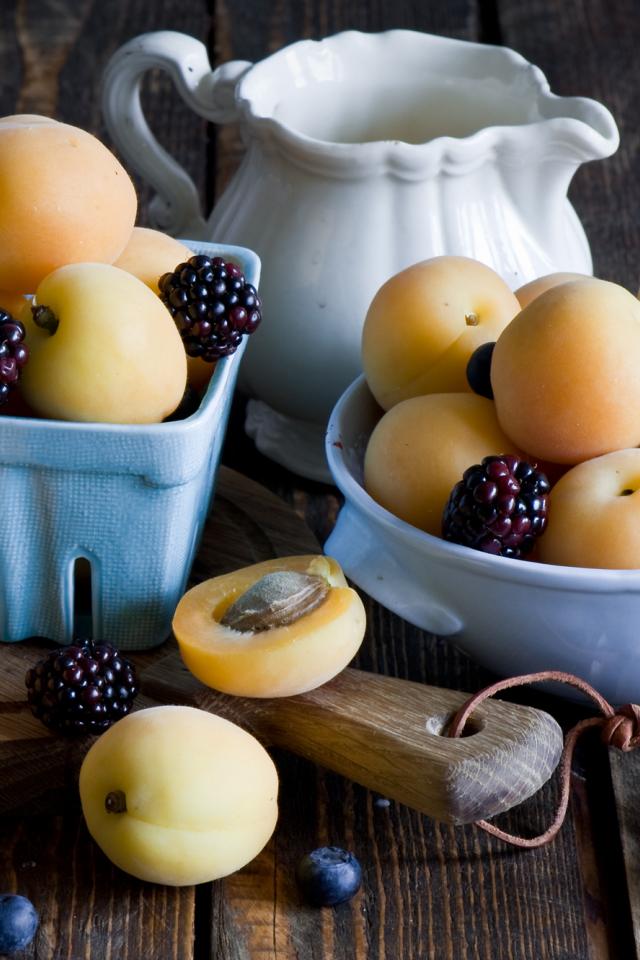Обои Спелые абрикосы и ягоды на столе