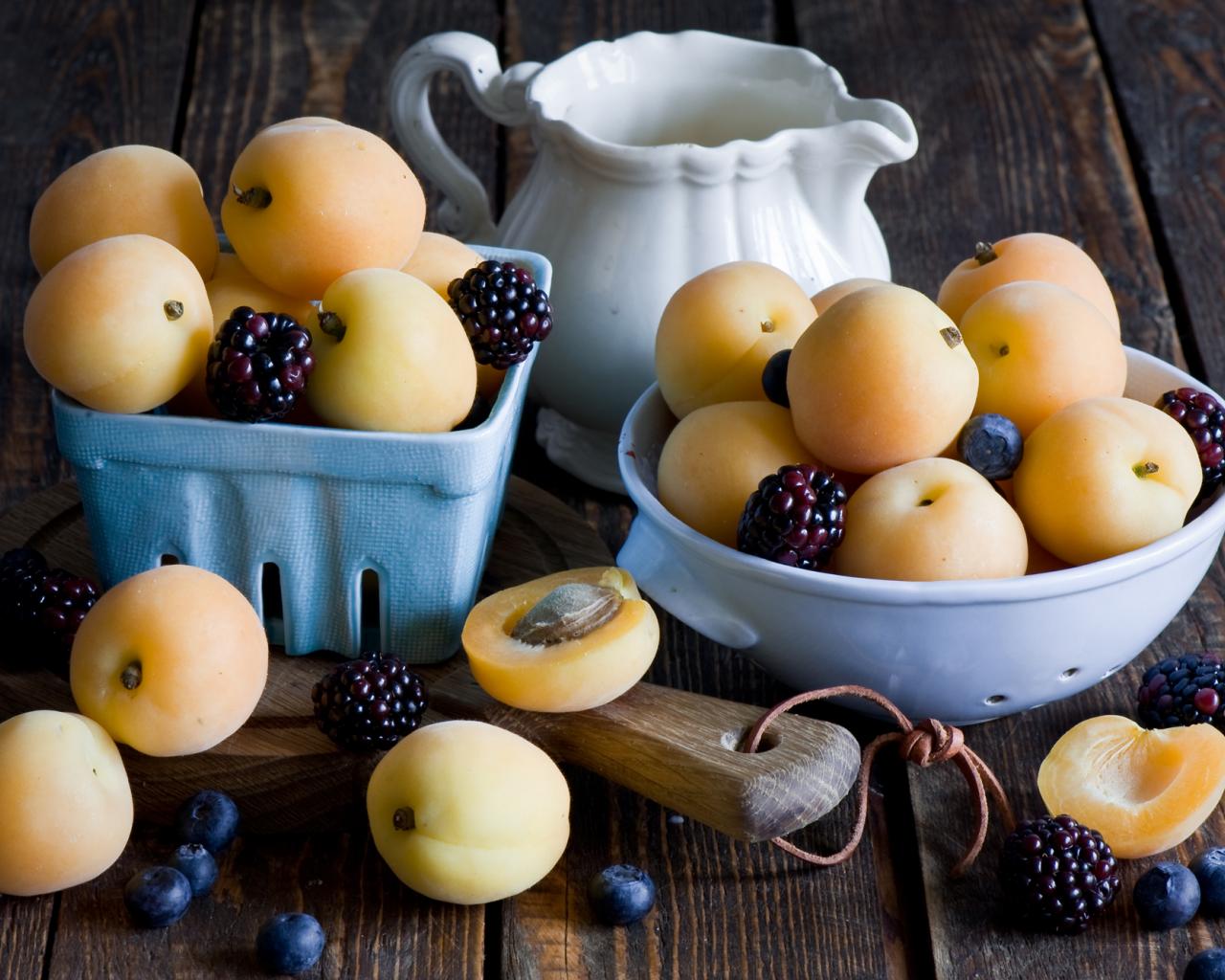Обои Спелые сочные абрикосы на столе с ягодами черники