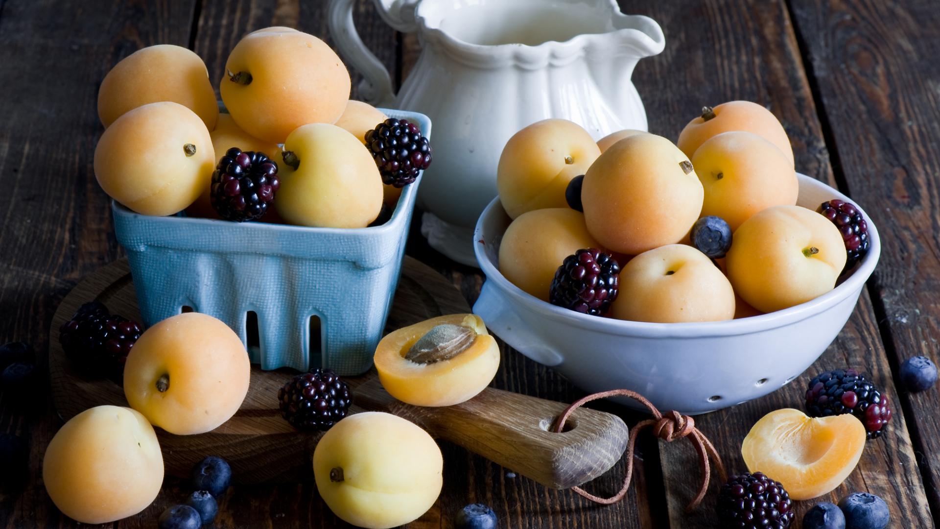 Обои Спелые сочные абрикосы на столе с ягодами черники