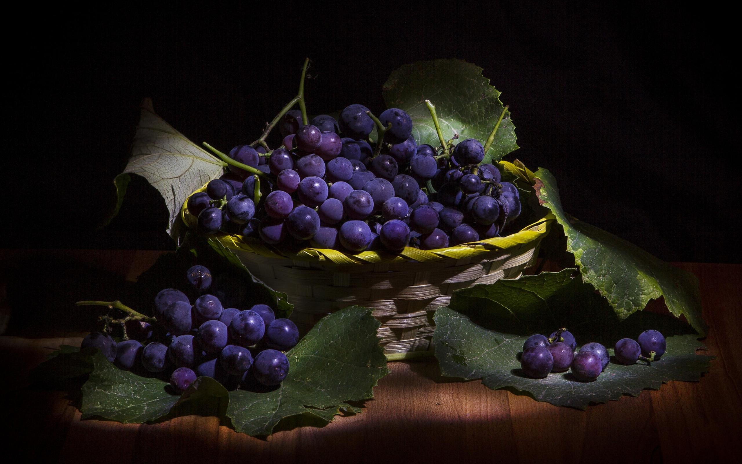 Обои Круглый синий виноград в корзине на столе