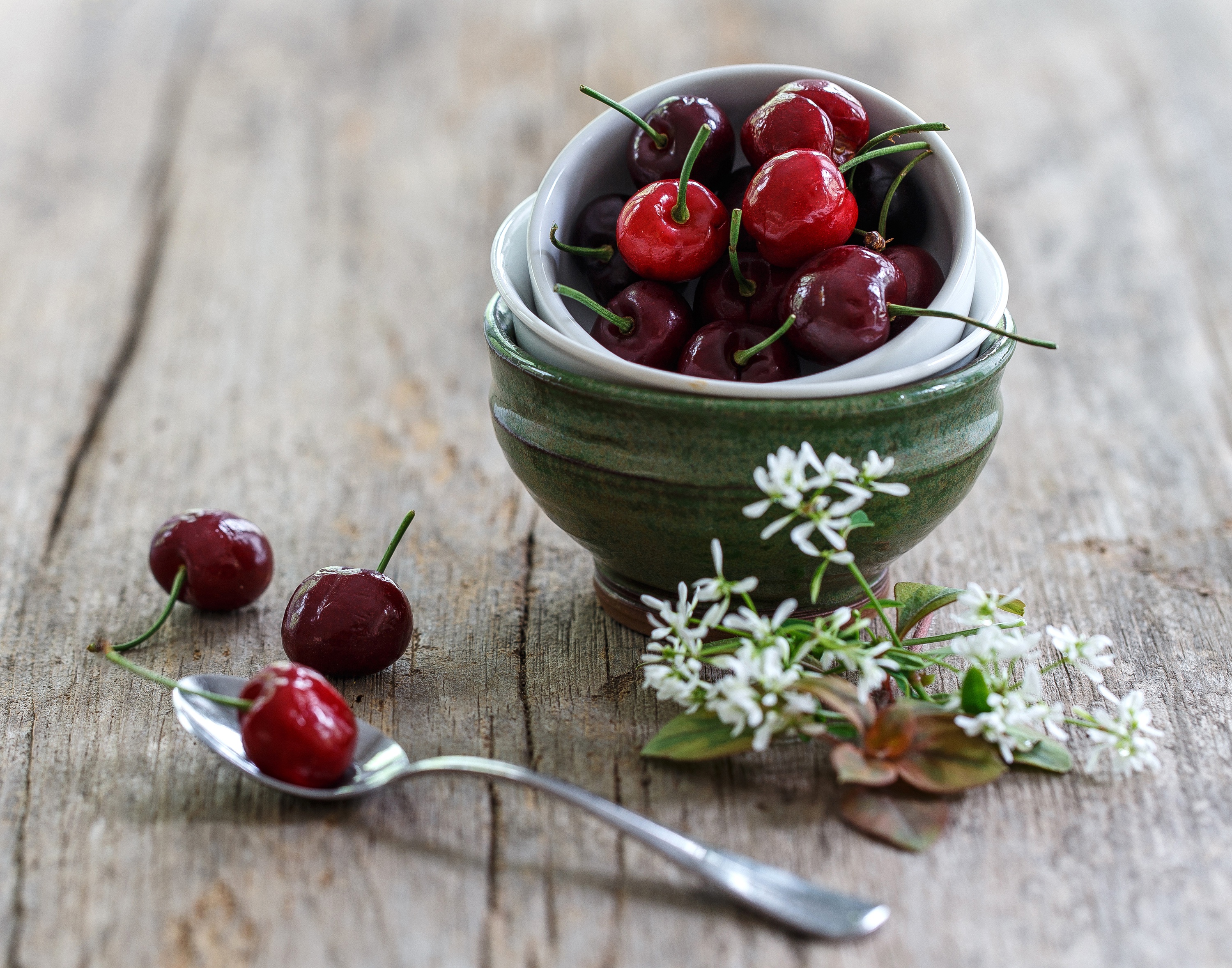 Обои Спелые красные черешни на столе в белом чайнике