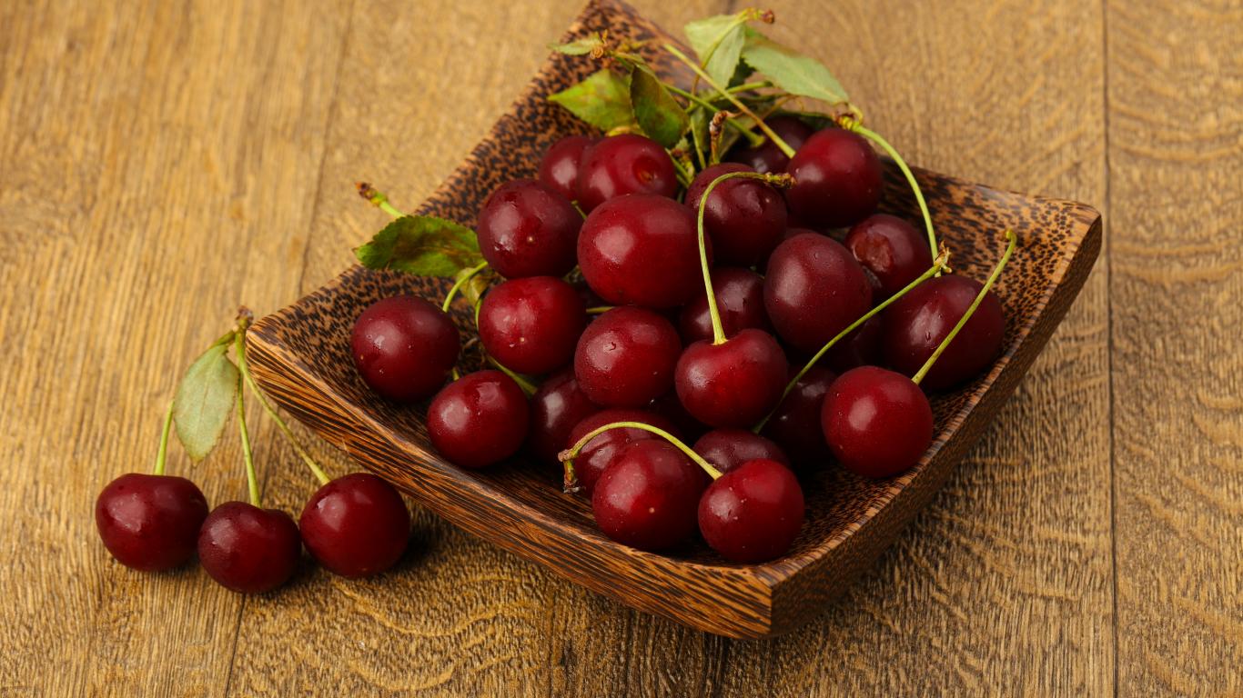 Обои Спелые вишни в капельках воды на столе с маленьким железным ведерком