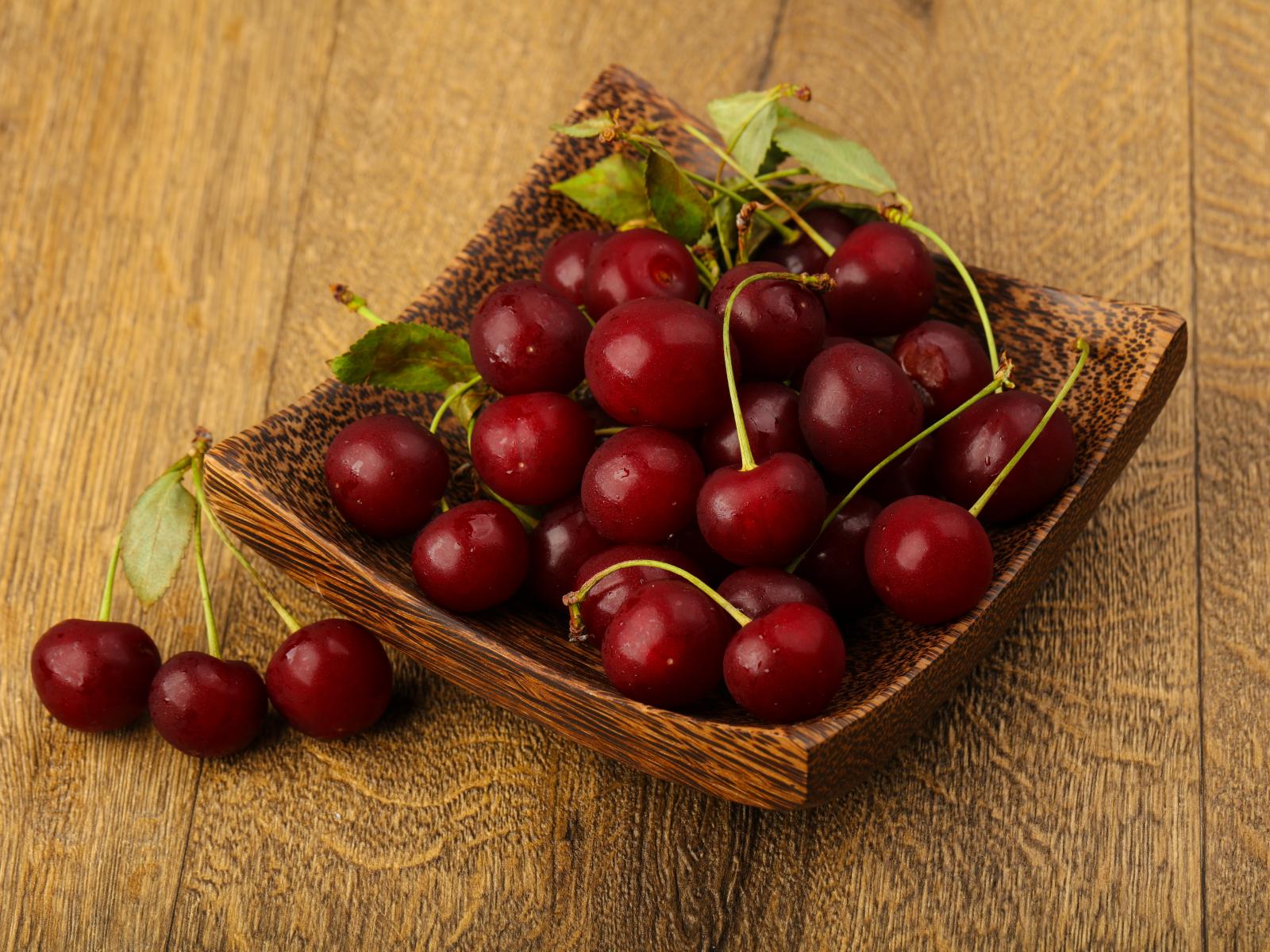 Обои Спелые вишни в капельках воды на столе с маленьким железным ведерком