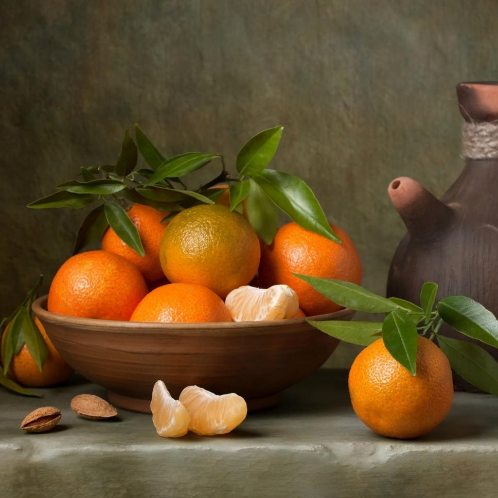 Обои Спелые мандарины на столе с кувшином