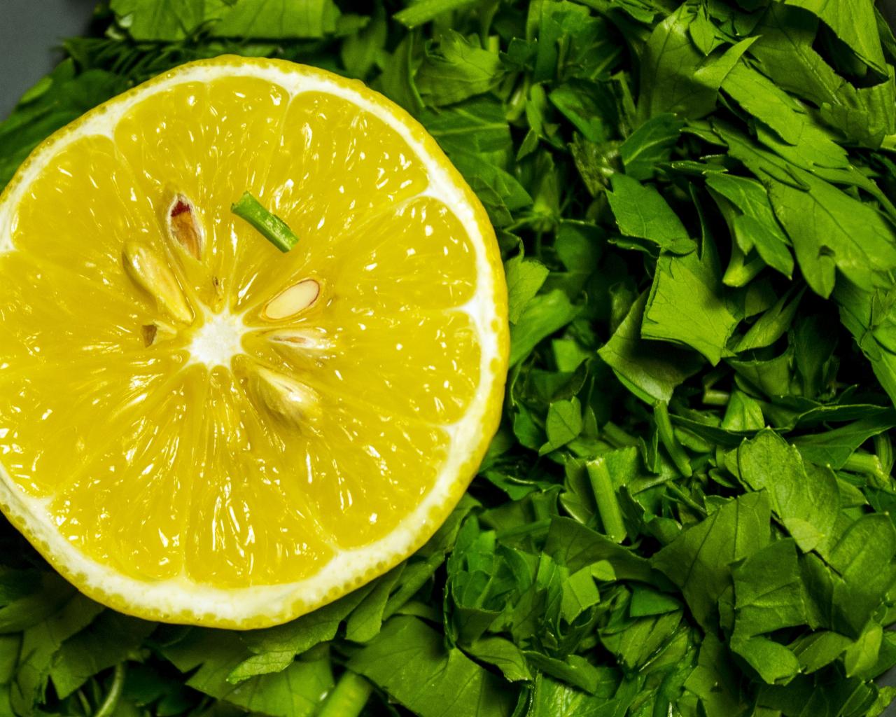Обои Половина желтого лимона с нарезанной зеленью петрушки