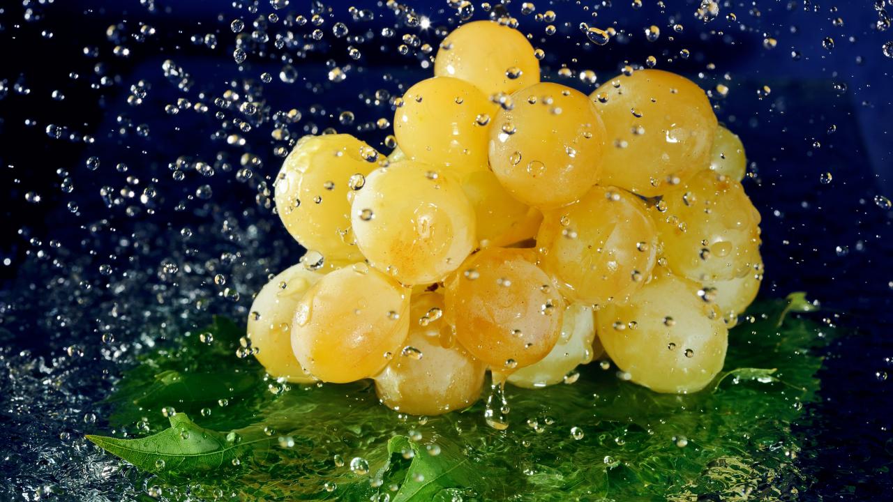 Обои Гроздь белого винограда в брызгах воды