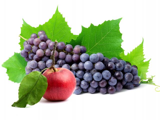 Обои Розовый виноград с яблоком на белом фоне