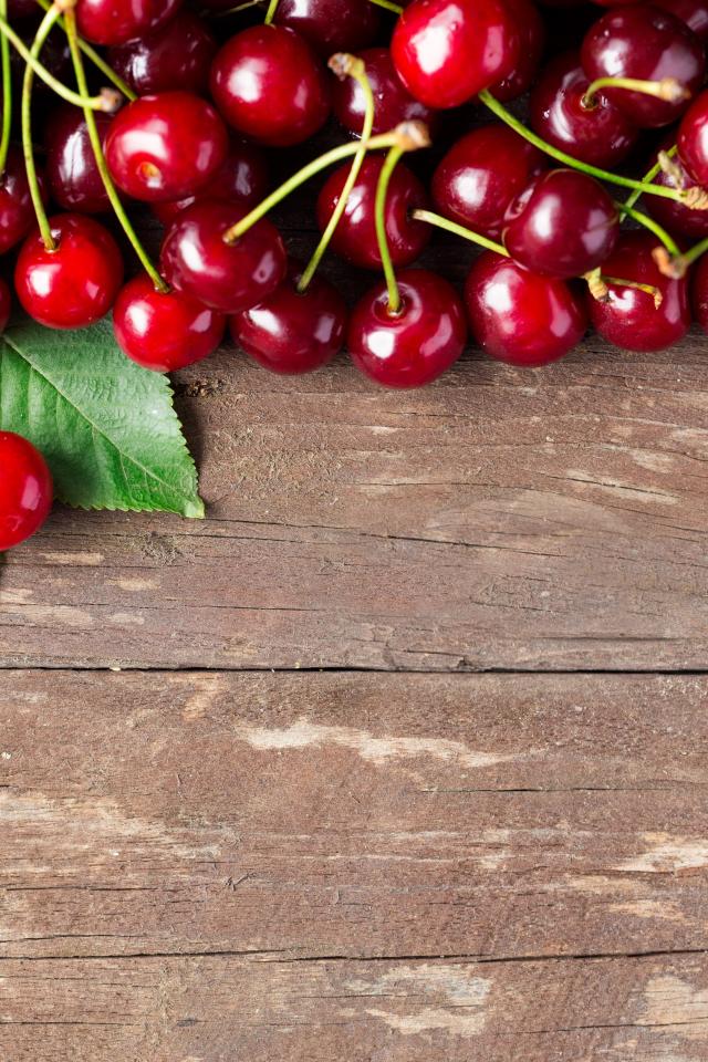 Обои Красные спелые вишни на деревянном столе