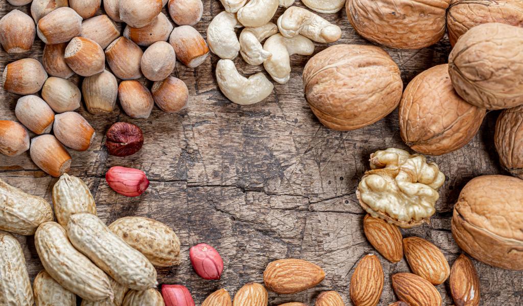 Обои Много различных орехов на деревянном столе