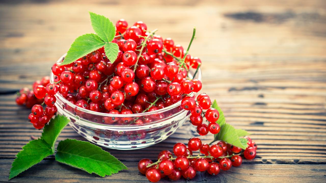 Обои Красная смородина в стеклянной миске на столе