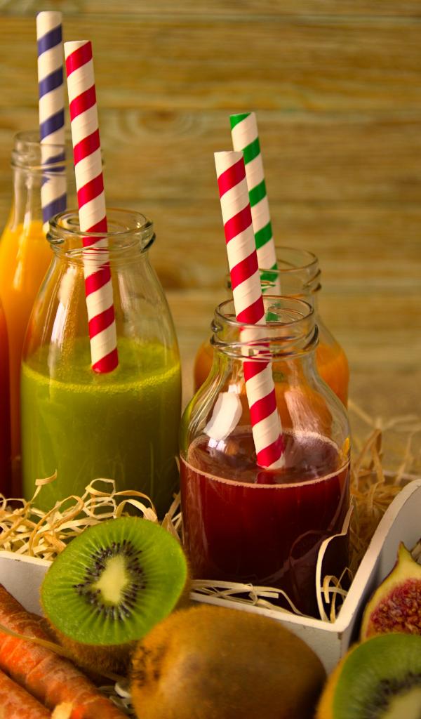 Обои Бутылочки с соком на столе с фруктами
