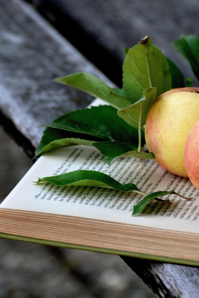 Обои Два яблока с зелеными листьями на книге