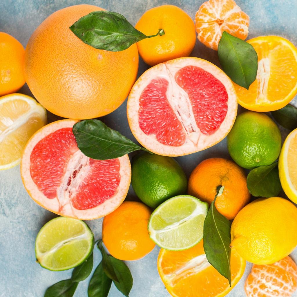 Обои Аппетитные цитрусовые фрукты с зелеными листьями