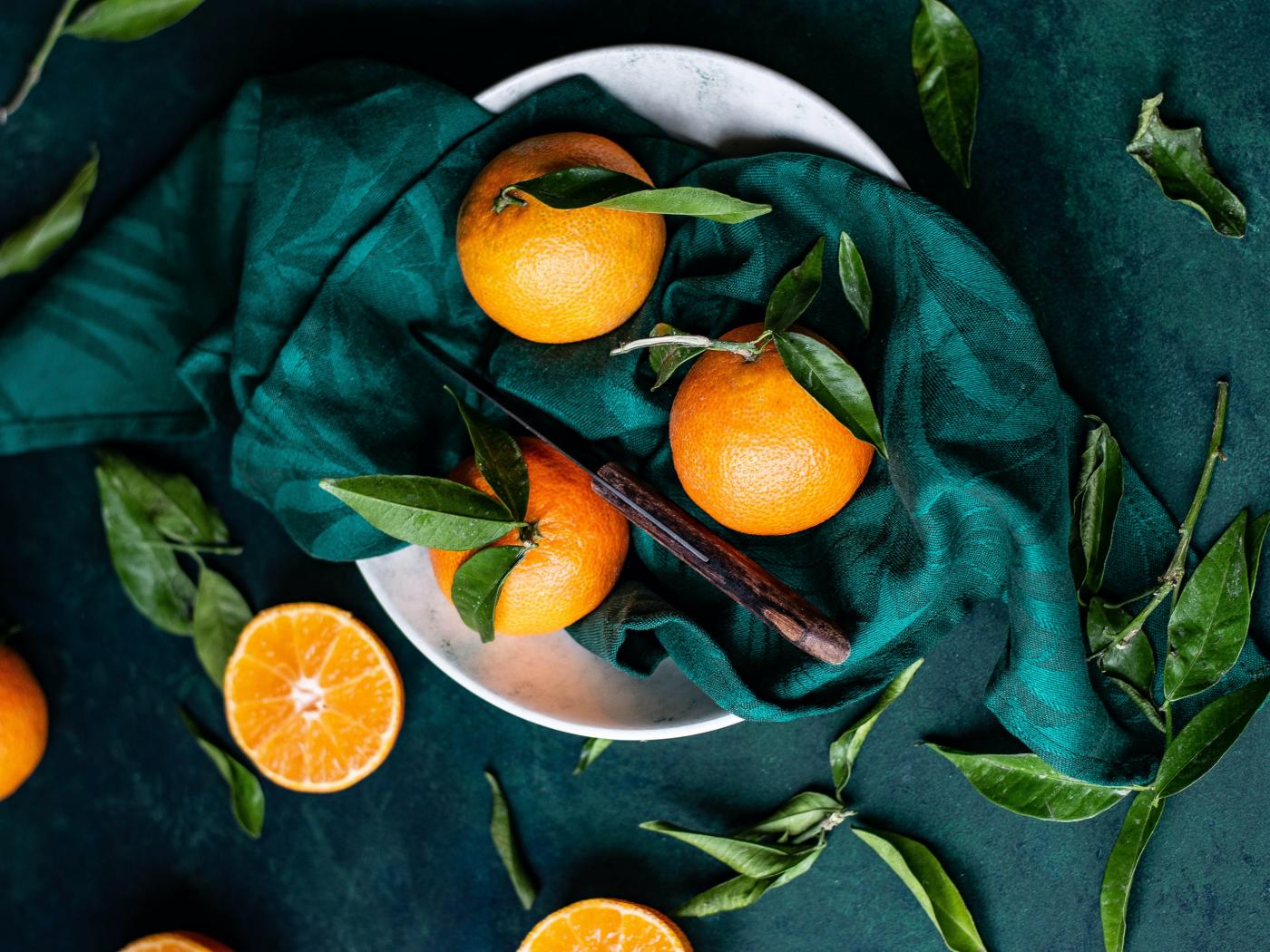 Обои Спелые мандарины на столе в платком